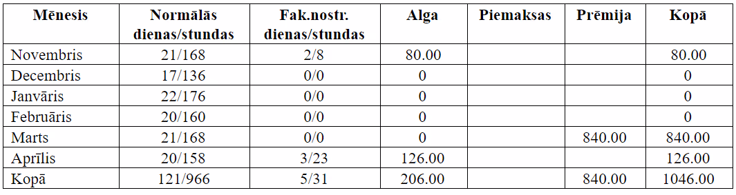Darbiniekam, saskaņā ar darba līgumu, noteikts normāls darba laiks, 5 dienu darba nedēļa, mēnešalga 840 EUR.
