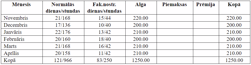 Darbiniekam, saskaņā ar darba līgumu, noteikts nepilns darba laiks – 10 stundas nedēļā, stundas tarifa likme 5 EUR/stundā. Noslogotība nevienmērīga, jo ir nedēļas, kad darbiniekam jāstrādā tikai 2 dienas pa 5 stundām dienā, citās nedēļās jāstrādā 5 dienas pa 2 stundām dienā, vēl kādu citu nedēļu jāstrādā 2 dienas pa 4 stundām dienā un vienu dienu 2 stundas. Visās nedēļās darbinieks būs nostrādājis 10 stundas.